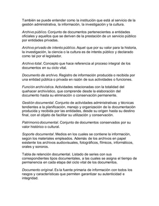 La ley 594 de 2000 establece las reglas y principios generales que regulan la función archivística del Estado colombiano. Define conceptos clave como archivo, documento de archivo y función archivística. Además, crea el Sistema Nacional de Archivos para coordinar las instituciones archivísticas del país y garantizar la preservación del patrimonio documental y el acceso a la información.