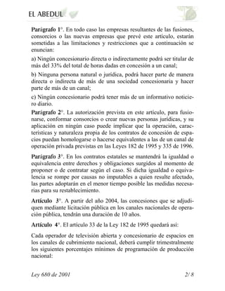 Este documento resume la Ley 680 de 2001 de Colombia, la cual reforma varias leyes relacionadas con la televisión. La ley aumenta el límite de inversión extranjera en canales de televisión al 40% y establece nuevos requisitos mínimos de contenido nacional en la programación. También autoriza fusiones entre concesionarios de canales públicos y privados, sujeto a límites en la tenencia de horas y canales. Finalmente, la ley facilita el acceso a infraestructura para expandir la cobertura de señales de tele