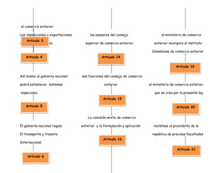 Este documento presenta los capítulos y artículos de la Ley 7 de 1991 de Colombia sobre el Ministerio de Comercio Exterior. Se crea el Ministerio de Comercio Exterior como organismo encargado de dirigir el comercio exterior del país. También se establece el Consejo Superior de Comercio Exterior como organismo asesor del gobierno. Se definen las funciones y facultades de estas entidades en relación con la regulación de importaciones, exportaciones, zonas francas industriales y otros aspectos del comercio exterior colombiano.