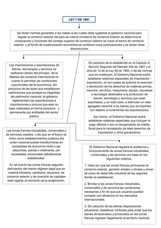 La ley 7 de 1991 establece las pautas para regular las zonas francas industriales, comerciales y de servicios en Colombia. Busca que promuevan el comercio exterior, generen empleo y divisas. También brindará condiciones para que sus usuarios compitan en mercados internacionales de manera eficiente. Se establecerán controles para evitar que bienes ingresen ilegalmente al territorio nacional. Además, el gobierno podrá establecer sistemas especiales de importación-exportación que autoricen exenciones o devoluciones
