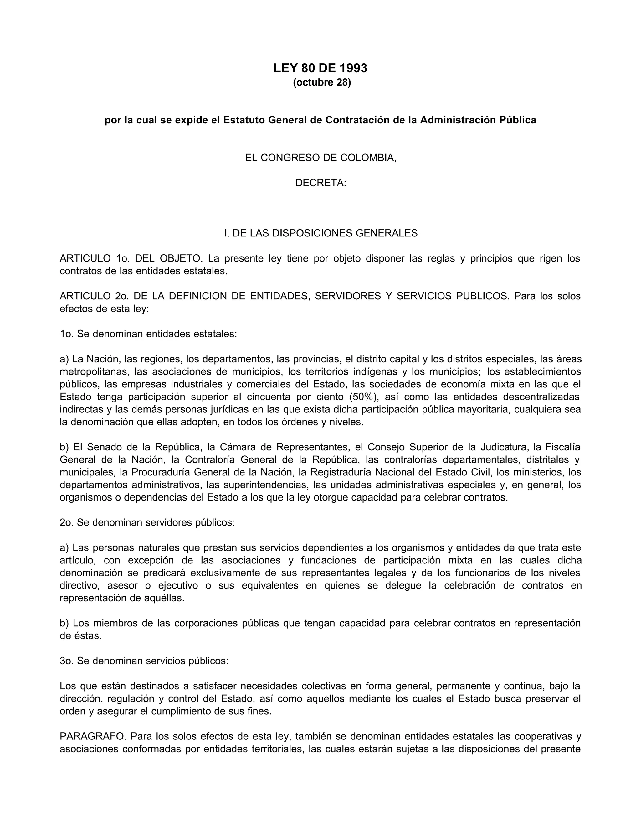 La Ley 80 de 1993 establece las reglas y principios que rigen los contratos celebrados por las entidades estatales en Colombia. Define entidades estatales, servidores públicos y servicios públicos. Establece los derechos y deberes de las entidades estatales y los contratistas en la ejecución de los contratos. También regula aspectos como la capacidad para contratar, los consorcios y uniones temporales.