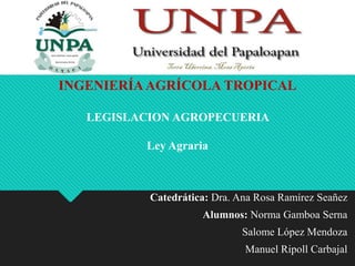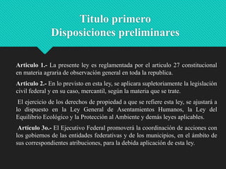 Este documento presenta un resumen de la legislación agraria mexicana. Establece disposiciones preliminares sobre la aplicación de la ley y la coordinación entre entidades federales. Luego describe cómo el gobierno promoverá el desarrollo agropecuario sostenible y la protección de recursos naturales. Finalmente, detalla las características de los ejidos, incluyendo los derechos de ejidatarios, la herencia de derechos, y los órganos de gobierno de los ejidos como la asamblea y el comisariado ejidal