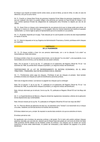 Este documento presenta un resumen de la Ley de Cheques en Ecuador. Establece los requisitos para la emisión válida de cheques, incluida la necesidad de indicar el nombre del girado, el lugar de pago, la fecha y la firma del girador. También regula la transmisión de cheques mediante endosos, prohibiendo los endosos en blanco, al portador o segundos endosos. Finalmente, define quién se considera un tenedor legítimo de un cheque.