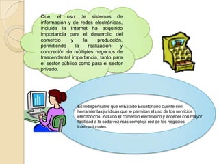El documento presenta los principales aspectos de una propuesta de ley general sobre comercio electrónico en Ecuador. La ley regularía el uso de mensajes de datos, firmas electrónicas, servicios de certificación, contratación electrónica, prestación de servicios en línea e incluye el comercio electrónico. Algunos de los temas clave que aborda son el reconocimiento legal de los mensajes de datos, la validez de la información incorporada por remisión, la protección de datos personales y la responsabilidad por el contenido de los mensajes inter