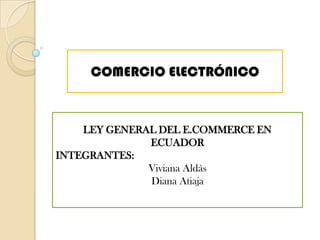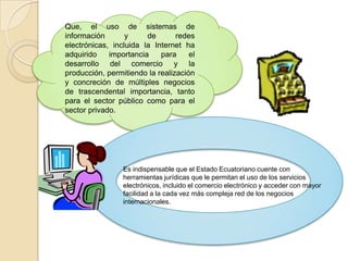 El documento presenta un resumen de la Ley General del Comercio Electrónico en Ecuador. Establece los principios de reconocimiento jurídico de los mensajes de datos y firmas electrónicas, así como los requisitos para la validez y conservación de la información en formatos electrónicos. También regula aspectos como la certificación de firmas digitales, responsabilidades de las entidades certificadoras y el marco para el comercio electrónico transfronterizo.