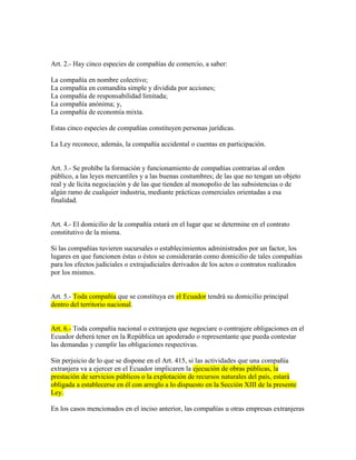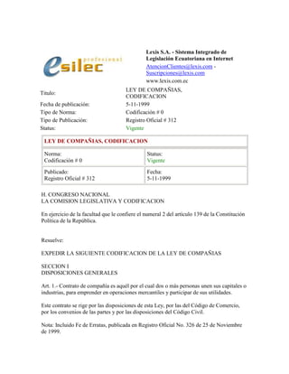 La ley presentada codifica la Ley de Compañías en Ecuador. Algunos puntos clave incluyen: 1) Define cinco tipos de compañías (en nombre colectivo, en comandita, de responsabilidad limitada, anónima y de economía mixta) que constituyen personas jurídicas; 2) Establece requisitos como tener un domicilio y representante legal en Ecuador para compañías que operen en el país; 3) Detalla reglas sobre aportes, administración, balances financieros y transferencia de acciones. La ley busca regular la constituc