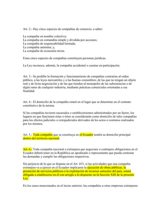 Este documento presenta extractos de la Ley de Compañías de Ecuador, incluyendo disposiciones generales sobre la definición de contrato de compañía, las diferentes especies de compañías, el domicilio de las compañías, la representación legal de compañías nacionales y extranjeras, la constitución y funcionamiento de compañías, y los derechos de los socios y accionistas.