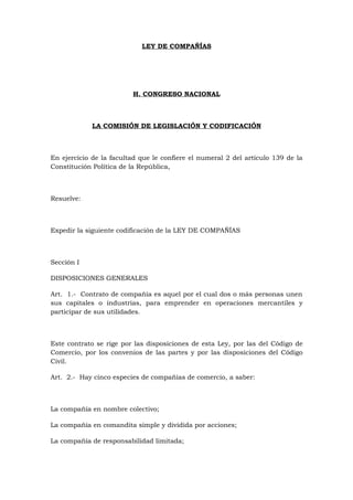 Este documento presenta una codificación de la Ley de Compañías en Ecuador. Establece cinco tipos de compañías (en nombre colectivo, en comandita, de responsabilidad limitada, anónima y de economía mixta) y regula aspectos como la constitución, funcionamiento, obligaciones de presentación de documentación y responsabilidades de las compañías y sus representantes. También crea un registro de sociedades bajo la Superintendencia de Compañías para supervisar el cumplimiento de la ley.