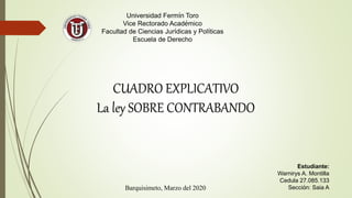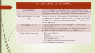 El documento resume la Ley sobre Contrabando de Venezuela. Establece que la ley fue promulgada en 2010 para combatir eficientemente el delito de contrabando. Aplica a cualquier persona dentro de Venezuela que trate de introducir, extraer o transitar mercancías de forma ilícita. Define el contrabando como actos para eludir la intervención del Estado con el objetivo de evitar el control aduanero. Describe los tipos de contrabando y los órganos competentes para aplicar la ley, cuyo propósito principal es regular las conductas que puedan a