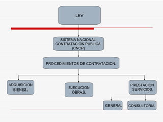 El documento presenta una descripción general del Sistema Nacional de Contratación Pública en Ecuador. Establece los objetivos, principios, organismos competentes e Instituto Nacional de Contratación Pública. También define los procedimientos de contratación, como licitaciones, subastas inversas, compras por catálogo y cotizaciones.