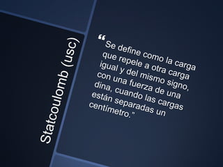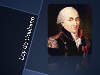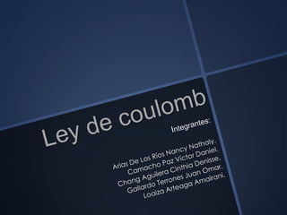 El documento describe la ley de Coulomb, la cual establece que la fuerza entre dos cargas eléctricas puntuales varía directamente con el producto de las cargas e inversamente con el cuadrado de la distancia entre ellas. Coulomb demostró experimentalmente esta relación y la representó matemáticamente. Además, la ley establece que cargas del mismo signo se repelen y de distinto signo se atraen.
