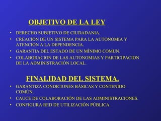 La Ley 39/2006 establece un sistema para garantizar la autonomía y atención a personas dependientes en España. Creó niveles de protección mínimos financiados por el estado y mayores financiados conjuntamente por las comunidades autónomas y el estado. Define grados de dependencia desde ligera a gran dependencia y cataloga una red de servicios de prevención, asistencia domiciliaria, centros de día y residencias. También establece prestaciones económicas periódicas según grado de dependencia para adquirir servicios de asistencia personal.