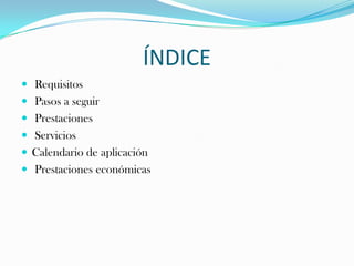 El documento proporciona información sobre los requisitos, pasos a seguir, prestaciones y servicios de la Ley de Dependencia de España. Detalla los requisitos para acceder a las ayudas, como ser ciudadano español o residente, y los pasos del proceso de solicitud. Explica que las prestaciones incluyen apoyo económico y servicios para mejorar la calidad de vida de las personas dependientes. También presenta los diferentes servicios cubiertos por la ley y el calendario de aplicación gradual de las ayudas en función del grado de dependencia.