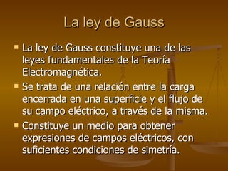 La ley de Gauss establece que el flujo del campo eléctrico a través de cualquier superficie cerrada es igual a la carga neta encerrada dividida por la constante de permitividad del vacío. Se usa principalmente cuando hay simetría, como en cargas puntuales, líneas de carga, placas conductoras o distribuciones esféricas. Para aplicarla, se selecciona una superficie gaussiana apropiada y se calcula la carga encerrada.