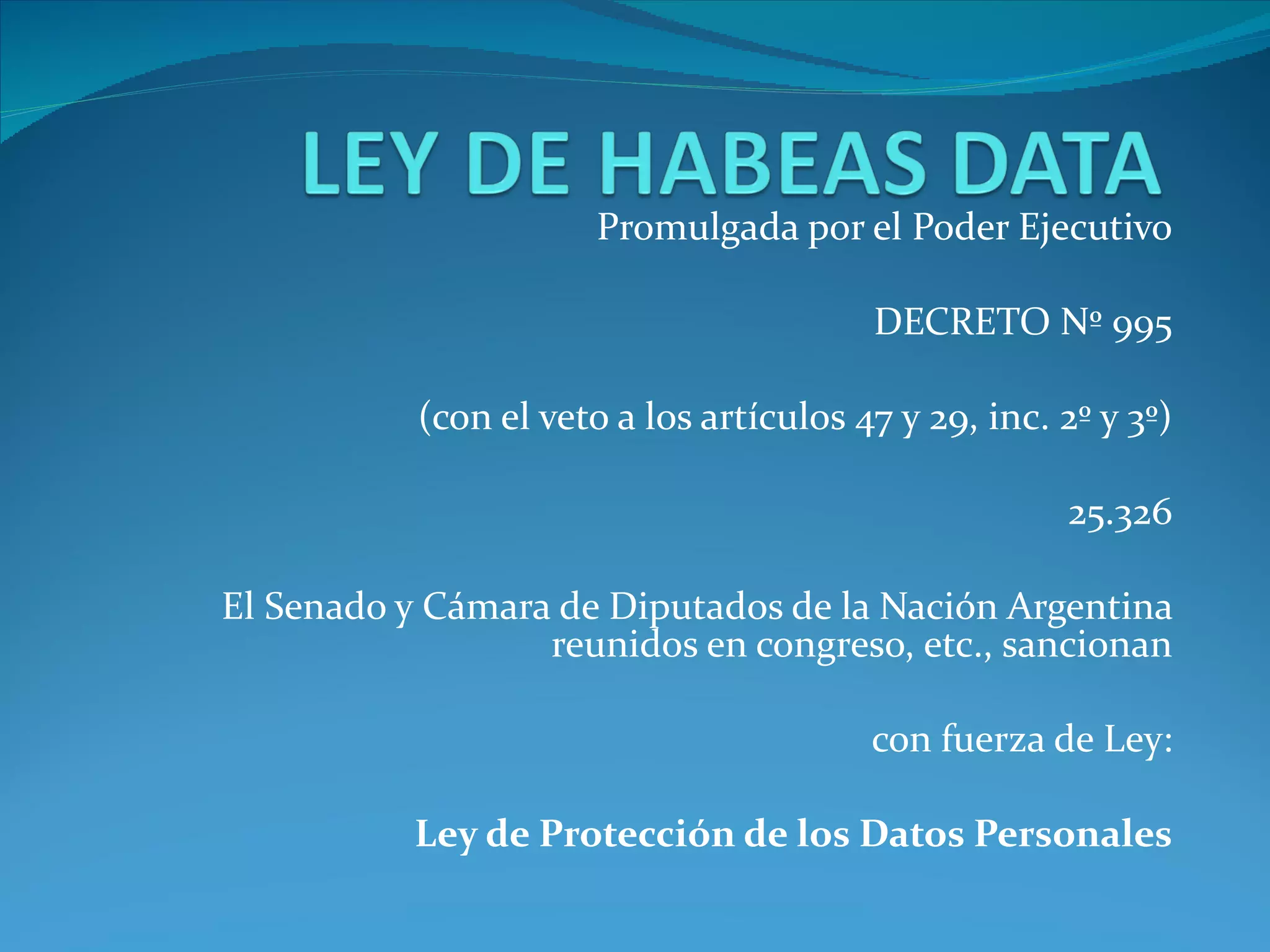 Este documento establece la Ley de Protección de Datos Personales en Argentina. Define principios como la licitud y calidad de los datos, el consentimiento de los titulares, y los derechos de los titulares a acceder, rectificar y eliminar sus datos. También regula el tratamiento de datos sensibles, la seguridad de los datos, cesiones y transferencias internacionales. Designa a un organismo de control y establece sanciones por incumplimiento de la ley.