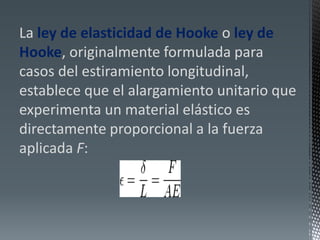 La ley de Hooke establece que la elongación de un material elástico es directamente proporcional a la fuerza aplicada. Fue formulada originalmente por Robert Hooke para casos de estiramiento longitudinal. Describe la relación entre la fuerza aplicada y la elongación producida en un resorte o material elástico usando la constante elástica. Explica el comportamiento elástico de los materiales hasta alcanzar su límite elástico.
