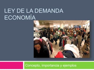 La ley de la demanda establece que cuando aumenta el precio de un bien, su cantidad demandada disminuye, y cuando el precio disminuye, su cantidad demandada aumenta. Los determinantes de la demanda incluyen los ingresos, gustos, precios de sustitutos y complementarios, expectativas y tamaño de la población. La tabla y curva de demanda muestran gráficamente la relación entre cantidad demandada y precio de un bien.