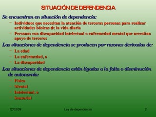 La ley de dependencia de España establece tres grados de dependencia - leve, moderado y severo - basados en la pérdida de autonomía y necesidad de ayuda con actividades básicas como comer, bañarse o vestirse. Las personas dependientes tienen derecho a servicios como asistencia domiciliaria, centros de día y residencias, así como prestaciones económicas. El procedimiento para obtener el reconocimiento incluye una solicitud, valoración y resolución por la administración correspondiente a la residencia.