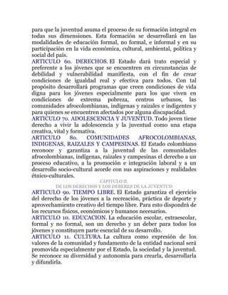 La ley 375 de 1997 crea el marco legal para las políticas de juventud en Colombia. Establece que los jóvenes entre 14 y 26 años tienen derecho a participar plenamente en la sociedad y serán apoyados en su formación integral. Además, crea el Sistema Nacional de Juventud para representarlos, con consejos de juventud a nivel municipal, departamental y nacional.