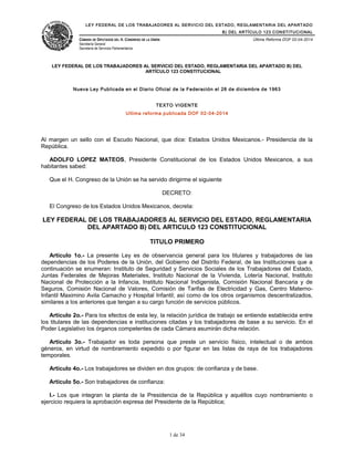 La Ley Federal de los Trabajadores al Servicio del Estado regula las relaciones laborales entre el gobierno y sus trabajadores en México, estableciendo disposiciones sobre la clasificación de trabajadores, sus derechos y obligaciones, y condiciones de trabajo. La ley distingue entre trabajadores de confianza y de base, y establece derechos irrenunciables para los trabajadores, además de detallar las jornadas laborales y condiciones específicas para el trabajo infantil y femenino. Esta ley también señala que los trabajadores de base deben ser de nacionalidad mexicana y protege sus derechos ante las fluctuaciones en la administración del gobierno.