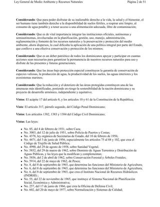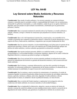 Este documento presenta la Ley General de Medio Ambiente y Recursos Naturales de la República Dominicana. Considera que el medio ambiente y los recursos naturales son bienes comunes que deben ser protegidos y aprovechados de manera sostenible para las generaciones presentes y futuras. También considera la necesidad de integrar las instituciones involucradas en la gestión de recursos naturales y el medio ambiente para aplicar una política ambiental efectiva. Finalmente, enumera las leyes existentes relacionadas con el medio ambiente y los recursos naturales.