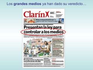El documento presenta opiniones de varios expertos y figuras públicas sobre un proyecto de ley de servicios de comunicación audiovisual que será tratado en el Congreso argentino. La mayoría expresan su apoyo al proyecto, señalando que promueve la diversidad, pluralismo, libertad de expresión y acceso democrático a medios. Algunos señalan preocupaciones sobre posibles presiones de grandes medios en contra de la ley o sobre cómo se tratará la infancia.