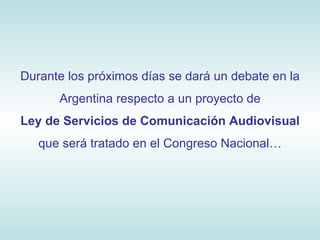 El documento presenta opiniones de expertos en comunicación, periodistas, académicos y figuras públicas que respaldan un proyecto de ley de servicios de comunicación audiovisual que será debatido en el Congreso de Argentina. La mayoría destaca que la propuesta garantiza el pluralismo, la diversidad, los derechos de los niños y el federalismo en los medios, y que representa un avance para la democracia al reemplazar una ley de la dictadura. Algunos señalan que grandes medios se opondrán a la ley.