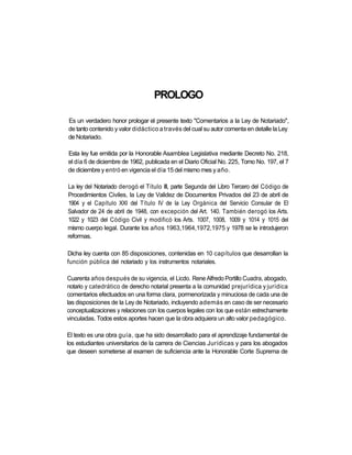 Este documento presenta el prólogo y la introducción de un libro titulado "Comentarios a la Ley de Notariado". En el prólogo, se describe brevemente la historia y propósito de la Ley de Notariado de El Salvador de 1962. La introducción explica algunos conceptos clave relacionados con el notariado como la fe pública, los instrumentos notariales y el sistema notarial salvadoreño. El documento proporciona contexto sobre la Ley de Notariado y el libro de comentarios que analiza dicha ley artículo por artículo.