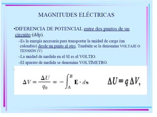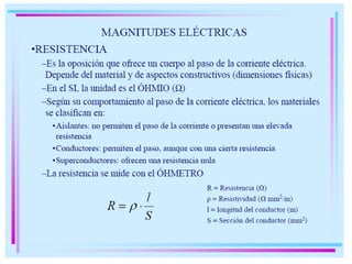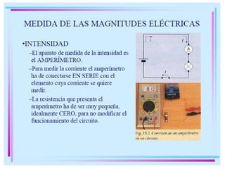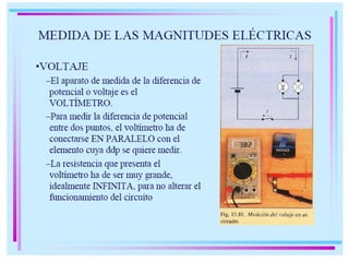 La ley de Ohm describe la relación entre la corriente eléctrica, la tensión y la resistencia en un circuito eléctrico. El amperímetro y el voltímetro son instrumentos utilizados para medir la corriente y la tensión en un circuito, respectivamente. Estos instrumentos fueron importantes para el desarrollo del ferrocarril y el telégrafo en el pasado.