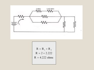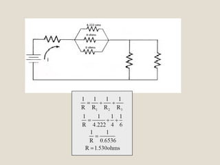 Este documento presenta un análisis detallado de un circuito eléctrico mixto que contiene resistencias en serie, paralelo y una combinación de ambos. Primero se simplifican las resistencias equivalentes en cada sección del circuito. Luego, se calculan las corrientes y diferencias de potencial en cada resistencia utilizando la ley de Ohm. Finalmente, se presenta una tabla con los valores de resistencia, voltaje, corriente de cada componente del circuito.