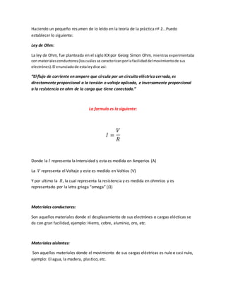 La práctica trata sobre la Ley de Ohm y el uso del protoboard. Resume la Ley de Ohm como V=IR, donde la intensidad de corriente I es directamente proporcional al voltaje V e inversamente proporcional a la resistencia R. Explica que el protoboard permite conectar circuitos electrónicos de manera temporal sin soldadura para probar prototipos. Recomienda tener cuidado al usar el protoboard para no dañarlo y facilitar el diagnóstico si hay fallas.
