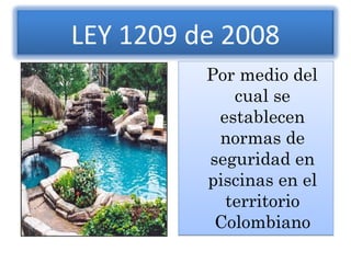 La ley 1209 de 2008 establece normas de seguridad para piscinas en Colombia. Aplica a todas las piscinas públicas o privadas de uso colectivo. Define medidas mínimas de seguridad como barreras de protección, control de acceso, detectores de inmersión y responsables. Establece un plazo para que las piscinas cumplan con estas normas de seguridad y sanitarias para proteger a los bañistas.