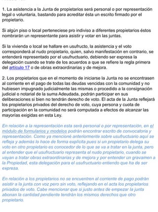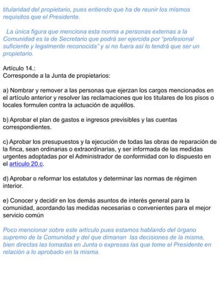El documento detalla las normativas de funcionamiento de la junta de propietarios, incluyendo la designación de cargos, la asistencia y representación de los propietarios, así como la validez de los acuerdos adoptados y el proceso de impugnación. Establece condiciones específicas para la toma de decisiones en relación a gastos comunes, obras, y servicios, requiriendo mayorías específicas para diferentes tipos de acuerdos. Además, subraya la importancia de la comunicación efectiva y cumplimiento de plazos para garantizar la legalidad de las decisiones tomadas en la junta.