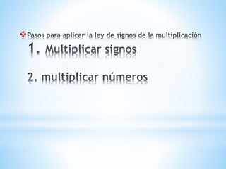 La ley de los signos establece que el producto de factores del mismo signo es positivo, mientras que el producto de factores de signos contrarios es negativo. Específicamente, un número negativo por un número negativo o un número positivo por un número positivo da como resultado un número positivo, mientras que un número negativo por un número positivo o un número positivo por un número negativo da como resultado un número negativo.