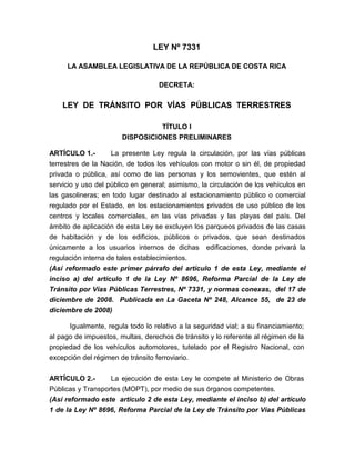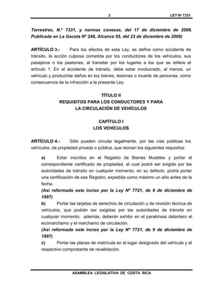 Este documento presenta extractos de la Ley de Tránsito por Vías Públicas Terrestres de Costa Rica. Establece que el Ministerio de Obras Públicas y Transportes es responsable de la ejecución de la ley. Define accidente de tránsito y establece requisitos para la circulación legal de vehículos como estar inscritos en el Registro de Bienes Muebles y portar placas de matrícula y permisos. También regula la propiedad de los vehículos y establece que el propietario registral es responsable civil de las