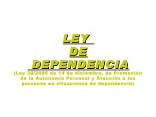 La Ley de Dependencia de 2006 establece un Sistema para la Autonomía y Atención a la Dependencia en España para garantizar los derechos de las personas en situación de dependencia. La ley define la dependencia y establece principios como la atención integral e individualizada, la calidad y accesibilidad de los servicios, y la colaboración entre los servicios sociales y sanitarios. El objetivo es promover la autonomía de las personas dependientes y garantizar el acceso a prestaciones independientemente de su lugar de residencia en España.