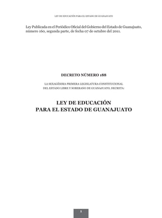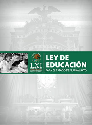 La ley establece los objetivos y principios de la educación en el estado de Guanajuato, México. Declara que la educación es un derecho de todos los habitantes y una responsabilidad del estado de proveer educación pública, laica y gratuita a nivel preescolar, primaria y secundaria. Además, define las autoridades educativas a nivel estatal y municipal y sus responsabilidades en la aplicación de esta ley.