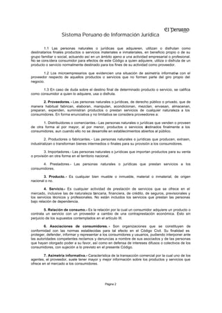 Este documento presenta el Código de Protección y Defensa del Consumidor aprobado por el Congreso de la República del Perú. El código establece normas para proteger los derechos de los consumidores y corregir asimetrías de información entre proveedores y consumidores. Define términos clave como consumidores, proveedores, productos, servicios y relaciones de consumo. También establece principios rectores como la soberanía del consumidor, la transparencia y la corrección de asimetrías de información.