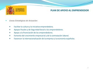 La ley de apoyo a los emprendedores y su internacionalización de 2013 establece medidas para fomentar la cultura emprendedora, apoya fiscal y financieramente a nuevos autónomos y busca la internacionalización de las empresas españolas. Incluye incentivos fiscales, apoyo a la contratación y mecanismos para facilitar la creación de empresas. Desde su implementación, ha generado más de 30,000 nuevos autónomos y ha incrementado la contratación y el acceso a financiación para pymes.