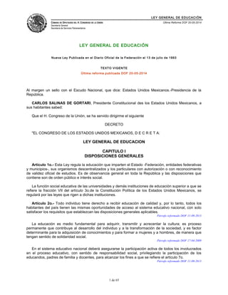 Este documento presenta la Ley General de Educación de México. Establece que la educación es un derecho de todos los ciudadanos mexicanos y que el Estado es responsable de proveer educación pública y gratuita de calidad a nivel preescolar, primaria, secundaria y media superior. Además, describe los objetivos y principios de la educación mexicana, como contribuir al desarrollo integral de los estudiantes, fomentar los valores democráticos y cívicos, y promover el conocimiento científico y cultural.