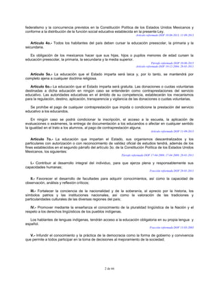 Este documento presenta el Capítulo I de la Ley General de Educación de México. Establece que la ley regula la educación impartida por el Estado, entidades federativas y municipios, así como por instituciones privadas autorizadas. También define los principios de gratuidad, laicidad y obligatoriedad de la educación preescolar, primaria y secundaria. Finalmente, presenta los objetivos de la educación mexicana en términos de formación integral de los individuos y el desarrollo de la nación.