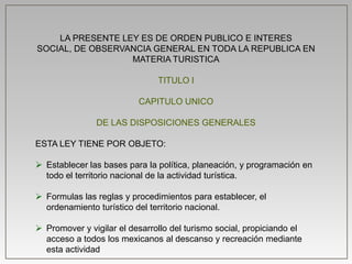 Este documento presenta un resumen de la Ley General de Turismo de México. Establece las bases para la política y planeación de la actividad turística a nivel nacional, estatal y municipal. Detalla las responsabilidades de las autoridades federales, estatales y municipales para promover el turismo social, accesible y sustentable, así como para preservar el patrimonio cultural del país con fines turísticos.