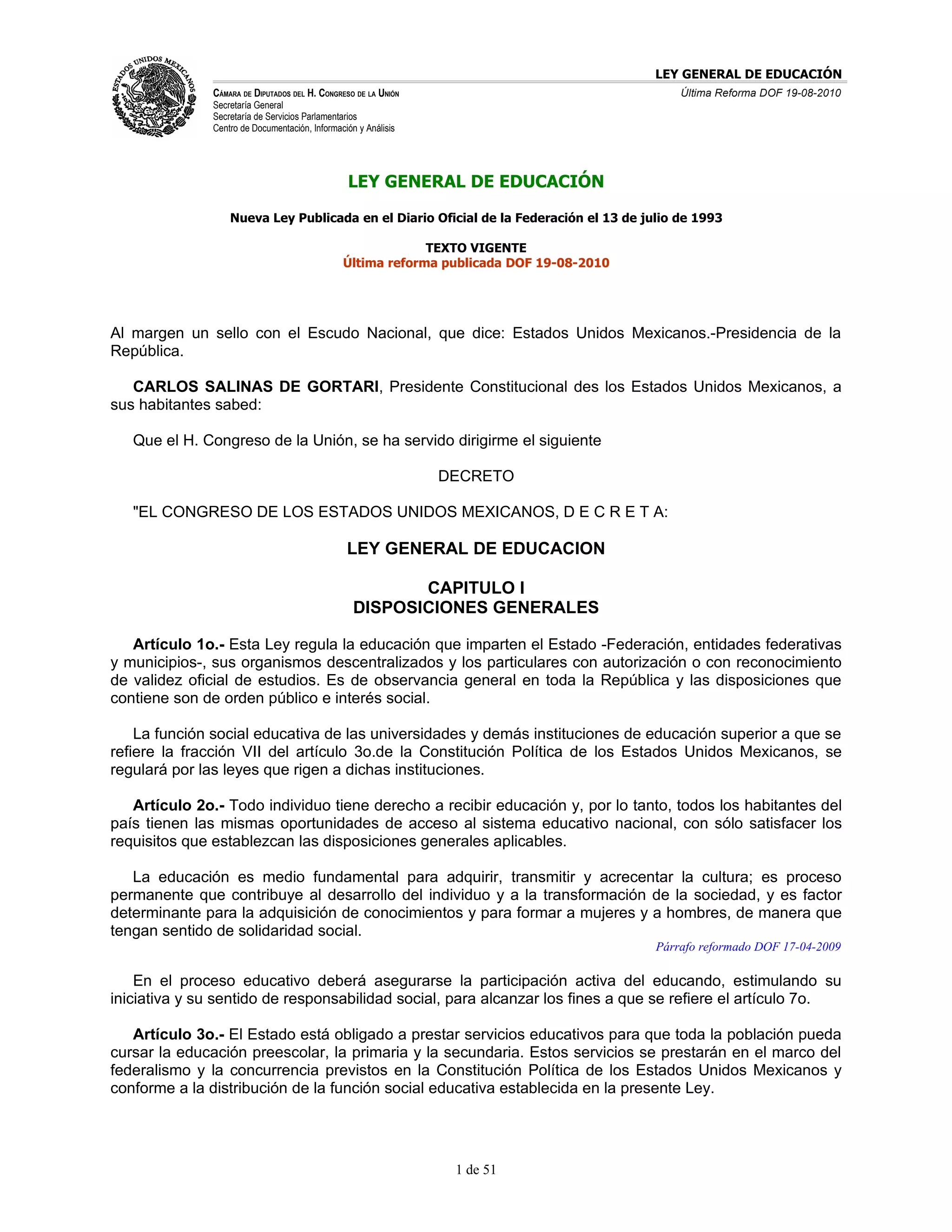 Este documento presenta la Ley General de Educación de México. Establece que la educación es un derecho para todos los mexicanos y un servicio público obligatorio que incluye la educación preescolar, primaria y secundaria. Define los fines y principios de la educación mexicana, como ser democrática, nacional, laica y gratuita. Distribuye las responsabilidades educativas entre el gobierno federal, estatales y municipales, y establece el marco legal para la educación en el país.