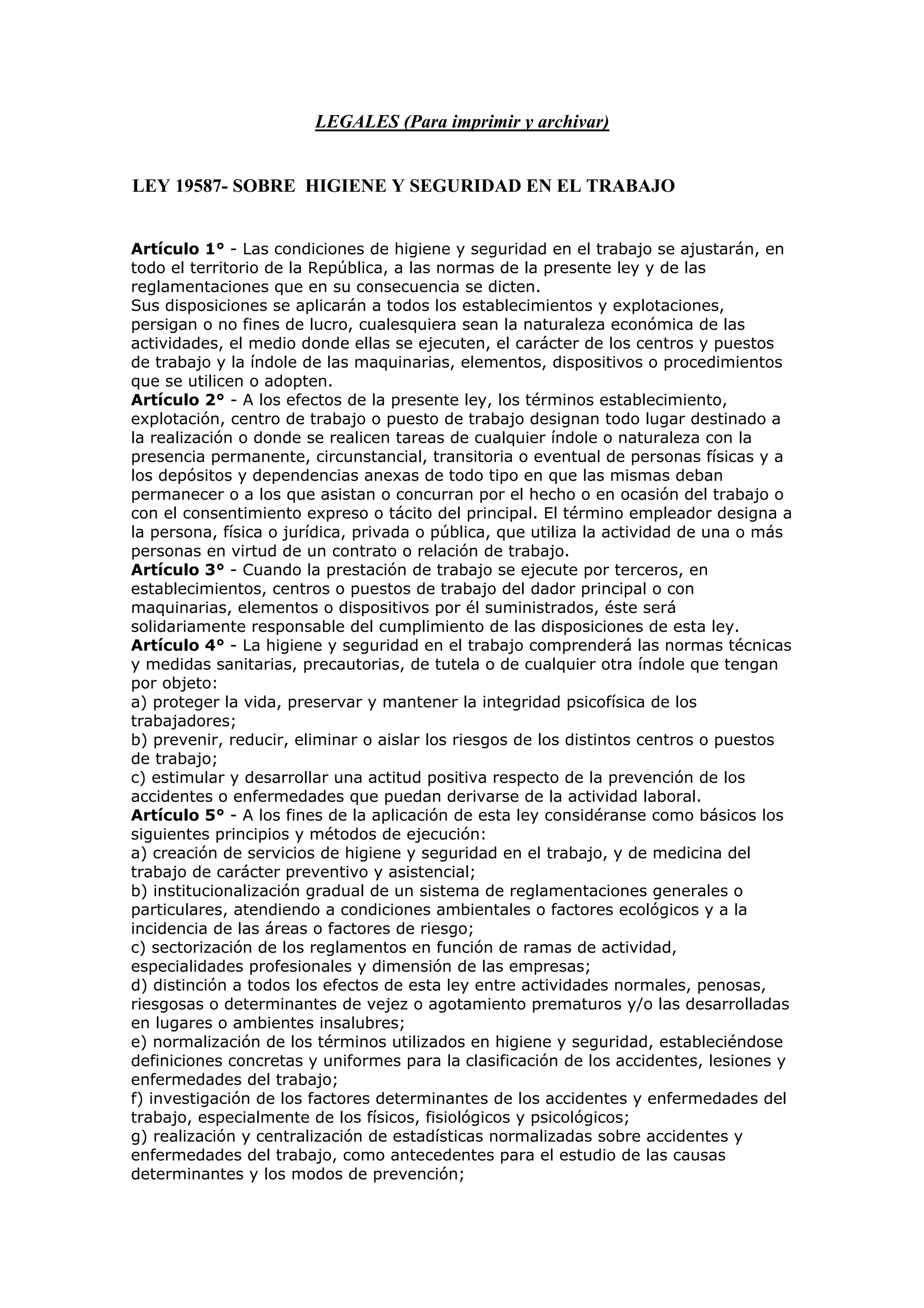Esta ley establece las normas de higiene y seguridad en el trabajo en Argentina. Define términos clave como establecimiento, empleador y trabajador. Detalla las obligaciones de los empleadores de adoptar medidas para proteger la salud y seguridad de los trabajadores, como exámenes médicos, equipos de protección, y capacitación en seguridad. También establece las obligaciones de los trabajadores de cumplir con las normas de seguridad y someterse a exámenes médicos. Autoriza al poder ejec