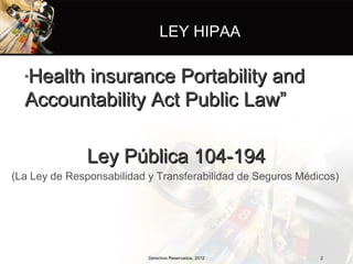La Ley HIPAA tuvo como objetivo principal proteger la confidencialidad de la información médica de los pacientes y reducir los costos administrativos en el sistema de salud. Estableció reglas sobre la transmisión electrónica de datos médicos, codificación universal y privacidad de la información. Incluye sanciones civiles y penales para quienes violen estas normas de privacidad.