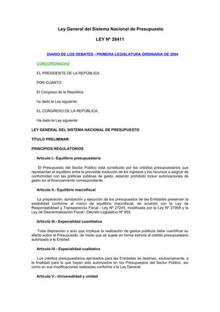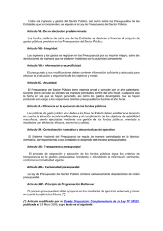 Este documento establece los principios y procesos que regulan el Sistema Nacional de Presupuesto en Perú de acuerdo con la Constitución. Define los componentes del sistema como la Dirección Nacional del Presupuesto Público y las entidades públicas a las que aplica la ley general de presupuesto. También describe las atribuciones de la Dirección Nacional del Presupuesto Público para programar, dirigir y controlar el proceso presupuestario a nivel nacional.