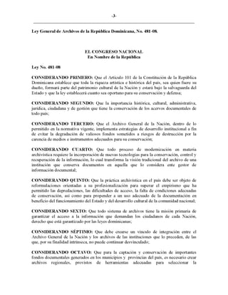 La ley establece el Sistema Nacional de Archivos de la República Dominicana y define sus objetivos principales como garantizar el acceso a la información pública, preservar documentos de valor histórico y cultural, y profesionalizar la práctica archivística en el país.