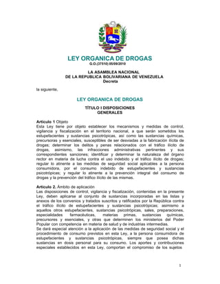 La Ley Orgánica de Drogas de Venezuela establece mecanismos de control y regulación sobre estupefacientes y sustancias psicotrópicas, incluyendo medidas de vigilancia, fiscalización y sanciones por delitos relacionados con el tráfico ilícito de drogas. También define el papel de la Oficina Nacional Antidrogas como el órgano rector encargado de diseñar y ejecutar políticas contra el tráfico y uso indebido de drogas, así como coordinar el tratamiento y rehabilitación de consumidores. La ley contempla disposiciones para la prevención integral del consumo de drogas y establece definiciones clave sobre sustancias y delitos asociados.