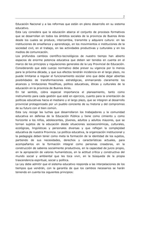 Este documento presenta los fundamentos y antecedentes de una nueva ley de educación provincial en Buenos Aires. Explica que la ley se alinea con las políticas educativas nacionales recientes y surge de amplias consultas con la comunidad educativa. También destaca principios como el derecho a la educación, la responsabilidad estatal y la calidad, y busca guiar el sistema educativo en los próximos años considerando cambios sociales y tecnológicos.