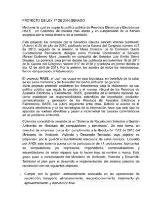 En Colombia no existe una legislación específica sobre residuos eléctricos y electrónicos. Sin embargo, el gobierno está trabajando en crear normas para regular la gestión de estos residuos de manera ambientalmente adecuada. Mientras tanto, empresas colombianas han establecido un sistema colectivo para la recolección y gestión de computadores y periféricos usados en las principales ciudades del país. Este sistema busca cumplir con los objetivos de recolección, transporte, almacenamiento y tratamiento ambientalmente adecuado de estos residuos